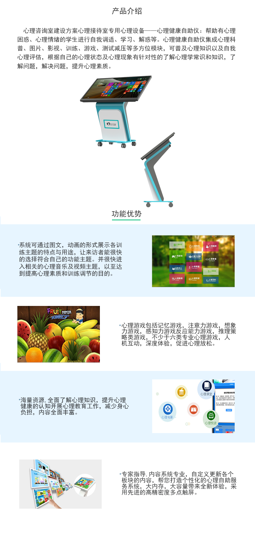 产品描述:心理自助管理平台通过点击查询了解自身心理问题,智能判断心理问题的程度和种类,同时针对来访者表现的心理问题进行调节和治疗,并可以实现情绪管理、缓解压力等心理服务。