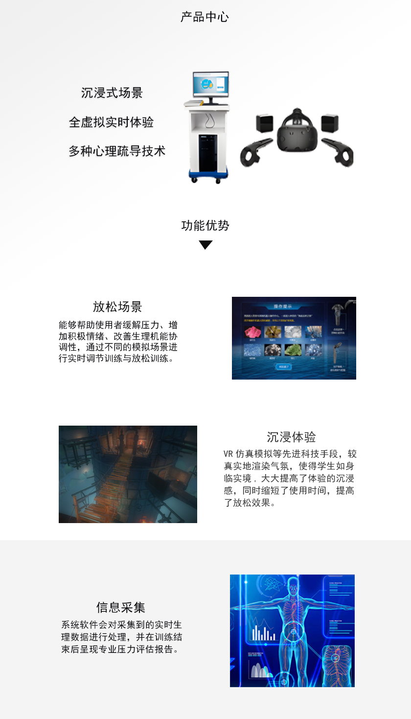 - 产品描述:VR反馈训练系统是以音乐放松理论为基础,集虚拟现实、生物反馈、智能传感等前沿技术于一身的新型情绪训练产品。在实时监测身心状态的同时,系统会综合分析数据,把抽象的心理状态转化成心境平衡指数,便于咨询师分析解读。通过让使用者在虚拟场景中获得高度的在场感和体验感,运用VR技术营造出草原、海滩、公园等自然场景,结合心理治疗专家研发的放松和情绪训练方案,可以显著提升放松和训练的效率,增强使用者的日常减压和情绪管理能力,对改善心理健康水平、提高心理素质有着明显效果。